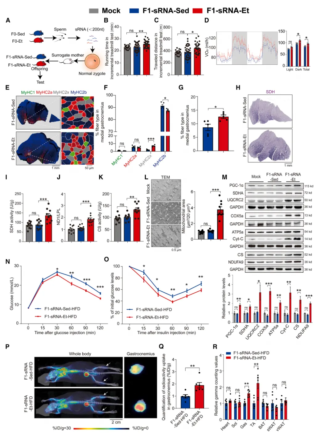 结果极具说服力:仅注射小RNA(sRNA)的子代(F1-sRNA-Et)就完整重现了运动表型——耐力提升、VO₂升高、氧化纤维增加【图4B-G】。高脂喂养实验进一步证实注射sRNA可改善子代葡萄糖稳态【图4N-R】。