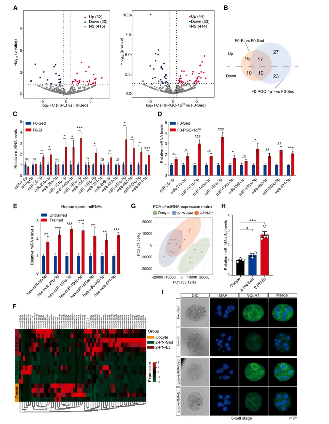 这些精子miRNA进入胚胎后做了什么?研究者检测了受精后2-原核期胚胎,发现运动父鼠来源的miRNA(如miR-148a-3p)成功传递至胚胎【图5H】。