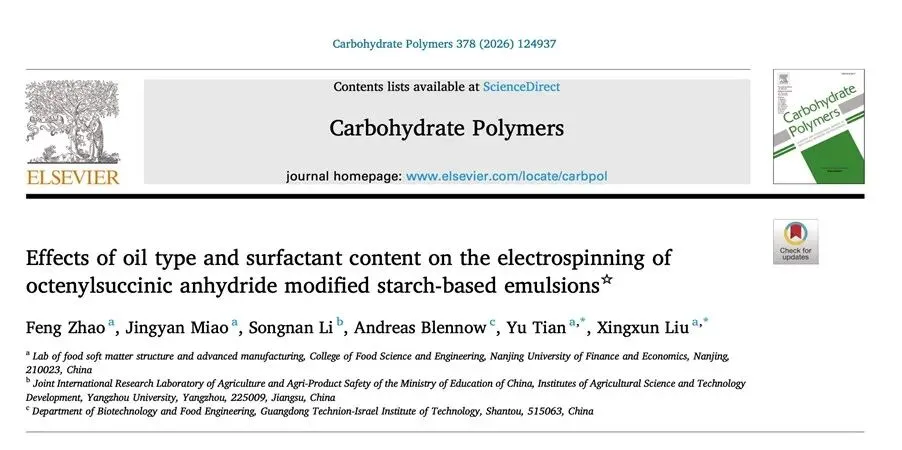 乳液静电纺丝是一种通过以水包油(O/W)乳液为纺丝介质制备核壳结构纳米纤维的有效方法,可实现对疏水性活性物质的高效包埋与控释。辛烯基琥珀酸酐(OSA)改性淀粉因其两亲性结构和优异的乳化性能,已广泛用于食品级乳液体系。然而,在OSA淀粉基乳液静电纺丝过程中,油脂类型与表面活性剂浓度如何影响乳液界面性质及纤维成形行为仍缺乏系统研究,相关调控机制尚不明确,制约了该体系在功能性递送领域的精准设计与应用。