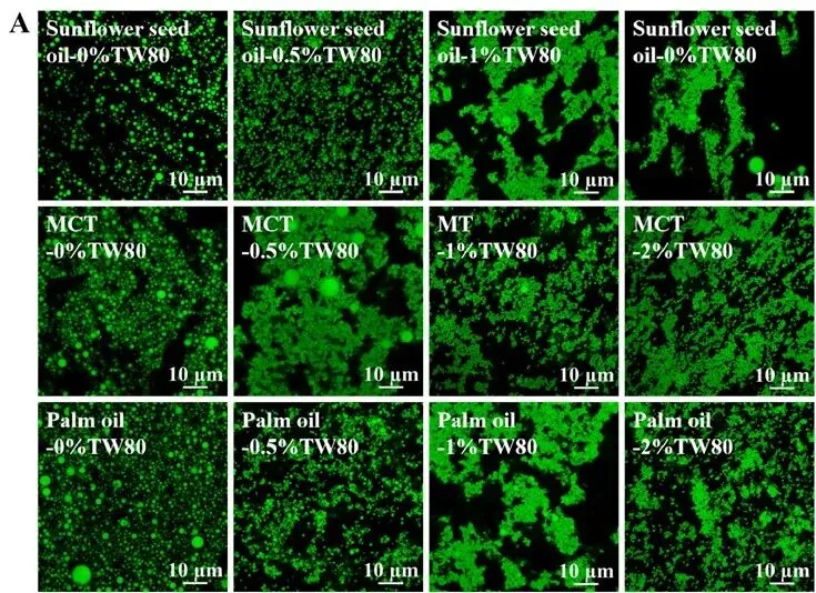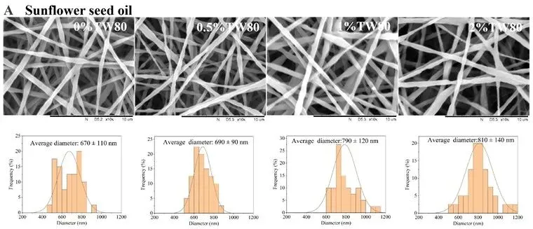 本研究以OSA改性淀粉-普鲁兰多糖复合体系为基础,选取了三种具有不同脂肪酸组成的食用油(向日葵油、中链甘油三酯MCT和棕榈油),结合不同浓度的Tween 80,系统制备了OSA淀粉基乳液并进行静电纺丝。研究从乳液稳定性、表观黏度、界面张力、电导率、Zeta电位和液滴粒径等多个维度对乳液性质进行了全面表征,并通过SEM、CLSM、TEM和FTIR等手段对纳米纤维的形貌、内部结构及化学组成进行深入分析,同时定量评价了不同体系纤维的载油量,系统揭示了油脂类型与表面活性剂浓度对乳液行为和纤维成形的协同调控机制。