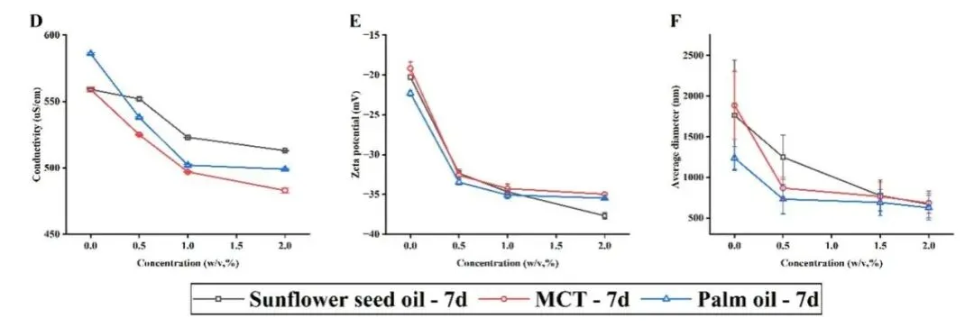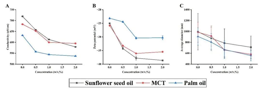 图6 不同油脂类型及Tween 80浓度下OSA淀粉基乳液的电导率、Zeta电位及平均液滴粒径