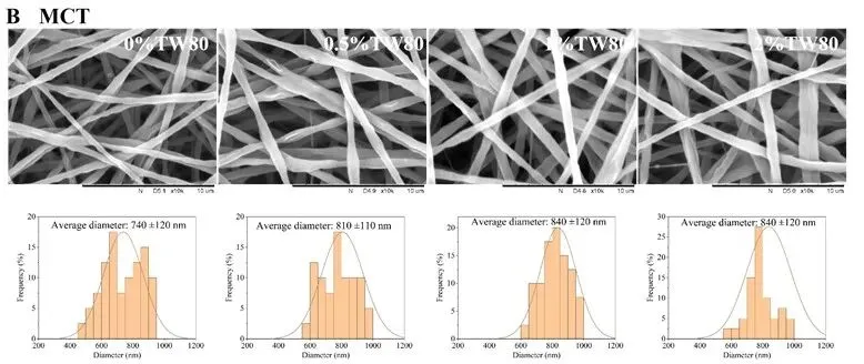 油脂类型与Tween 80浓度均通过调节乳液的黏度、界面张力、电导率及Zeta电位,影响OSA淀粉基乳液的稳定性及纤维形成行为。三种油脂中,向日葵油体系乳液稳定性较高,所得纤维直径较小且均一性较好,载油量最高;MCT和棕榈油体系由于界面张力较大,表现出较低的稳定性和载油能力。Tween 80的加入可提高乳液稳定性和载油效率,但同时导致纤维直径增加。在低浓度条件下,油脂类型对体系影响较为显著;随着Tween 80浓度增加,表面活性剂逐渐成为主导因素。本研究为OSA淀粉基乳液静电纺丝体系的配方设计提供了重要参考。