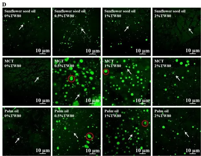 图3 不同油脂类型及Tween 80浓度下OSA淀粉基乳液的CLSM图像