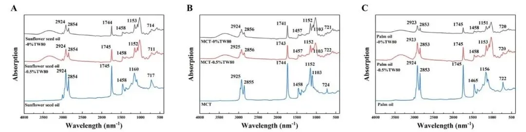 图8 不同油脂类型及Tween 80浓度下电纺OSA淀粉基乳液纳米纤维的FTIR光谱