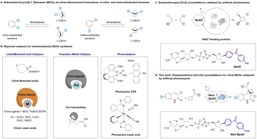 近日,南京大学潘惠杰课题组与厦门大学王斌举课题组合作在Journal of the American Chemical Society上发表研究,开发了一种基于NAD⁺类似物的人工光酶催化体系,首次实现了喹啉-2(1H)-酮与单取代双环丁烷(BCBs)的高对映选择性分子间[2π+2σ]环加成反应,核心思路是基于本课题组前期开发了一种光活性辅因子BpAD(二苯甲酮腺嘌呤二核苷酸),该NAD⁺类似物通过将烟酰胺基团替换为光敏剂实现功能改造。BpAD的引入可有效地将多种NAD⁺结合蛋白重塑为人工光酶,这些人工光酶可通过能量转移机制实现[2+2]环加成反应(Nature Catalysis 2025, 8,822)。通过对光活性辅因子BpAD进行结构修饰,以调控其光物理性质,引入给电子基团(如甲氧基)设计出MeO-BpAD,使其最大吸收红移至400 nm区域,有望在抑制底物背景反应的同时维持与各种NAD⁺依赖型蛋白质的特异性结合。将这种“可调”的光敏辅因子与工程化的蛋白质骨架结合,可重塑出一系列人工光酶,利用蛋白活性口袋的精准调控能力,实现高对映选择性的BCHs合成(图1)。