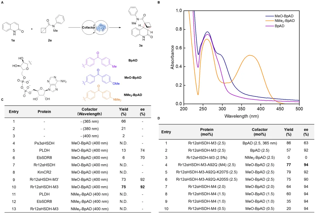 首先研究者以喹啉-2(1H)-酮(1a)与单取代BCB(2a)的作为模型反应。通过对波长的筛选发现,在400 nm下可基本抑制底物1a与2a的背景反应。基于此结果,研究者进一步对BpAD的结构进行修饰,合成了两种吸收光谱红移的辅因子MeO-BpAD和NMe₂-BpAD。在400 nm光照下,对一系列NAD⁺依赖型酮还原酶的野生型及突变体进行筛选。结果表明,当与工程化蛋白骨架Rr12aHSDH-M3结合时,MeO-BpAD可获得最佳反应结果(产率75%,92% ee)。NMe₂-BpAD因三线态能量与底物不匹配而表现出无活性。进一步引入A92Q突变,得到Rr12aHSDH-M4,反应结果进一步提升至77%产率和94% ee(图2)。