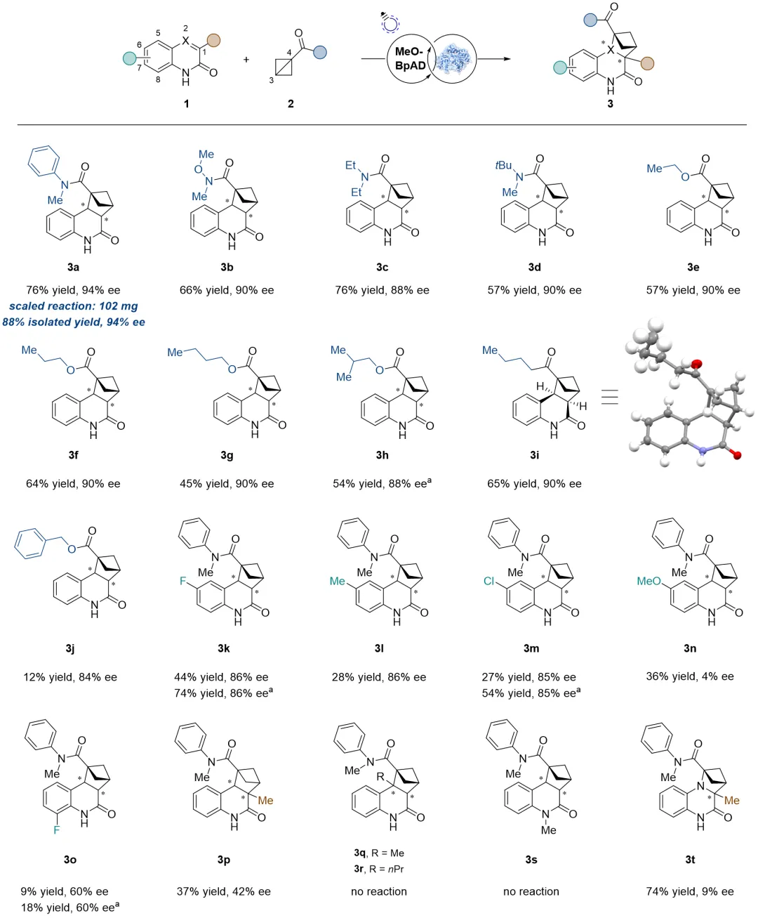 在最优反应条件下,该人工光酶体系具有较好的底物适用性,尤其对单取代联环丁烷(BCB)底物耐受性较好。带有不同位阻酰胺(从甲基到叔丁基,3a-3d)或不同链长酯基(3e-3h)的BCB均能以高产率(最高88%)和高对映选择性(高达94% ee)得到相应手性BCH产物。酰基取代的BCB(3i)也能有很好的兼容性。相比之下,对喹啉-2(1H)-酮(1)的修饰容忍度较低:喹啉酮的6-位取代会导致产率大幅下降(3k-3n),8-位取代进一步降低反应性(3o),1-位取代同时降低产率和对映选择性(3p),2-位取代则完全抑制产物生成(3q, 3r),N烷基取代也无法发生反应(3s),喹喔啉-2(1H)-酮类底物(如3t)表现出更高的反应性,但对映选择性有所降低。后续计算研究表明,这是由于蛋白活性口袋对喹啉酮的结合空间狭窄,微小的取代基位阻会破坏其结合取向,使反应双键难以与另一底物接触,而BCBs的结合区域空间充足,因此展现出更广的取代基耐受性,同时该反应体系可成功放大至0.34 mmol规模。