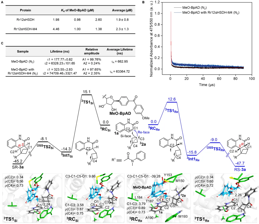 机理研究结合了实验与理论计算:等温滴定量热法测定表明结构修饰后的辅因子MeO-BpAD与蛋白质骨架(Rr12aHSDH-M4)仍可以保持一定结合力(Kd~2.3 μM)。瞬态吸收光谱显示,蛋白质的微环境使MeO-BpAD激发态寿命延长了约100倍(从0.66 μs提升至63 μs),增强了其能量转移能力。计算研究表明,反应遵循能量转移机制:MeO-BpAD吸收光后经系间窜越至三线态,并通过Dexter机制将能量转移给底物1a,使其成为三线态,随后三重激发态1a可激活2a形成激基复合物中间体3RC(exciplex),随后的C1-C3键形成是决速步。非共价相互作用(IGMH)分析和能量计算表明,在优势对映体(Re面进攻)的过渡态(³TS1Re)中,MeO-BpAD与1a之间存在显著的π-π堆积作用,且其静电相互作用能远低于非优势路径(Si面进攻,³TS1Si),这2.5 kcal·mol⁻¹的能垒差是立体选择性的主要来源。计算还解释了喹啉酮类底物范围受限的原因:底物1a的结合腔空间狭窄,因此在底物1上的取代基会通过空间位阻破坏1与2a的最佳反应几何构型。