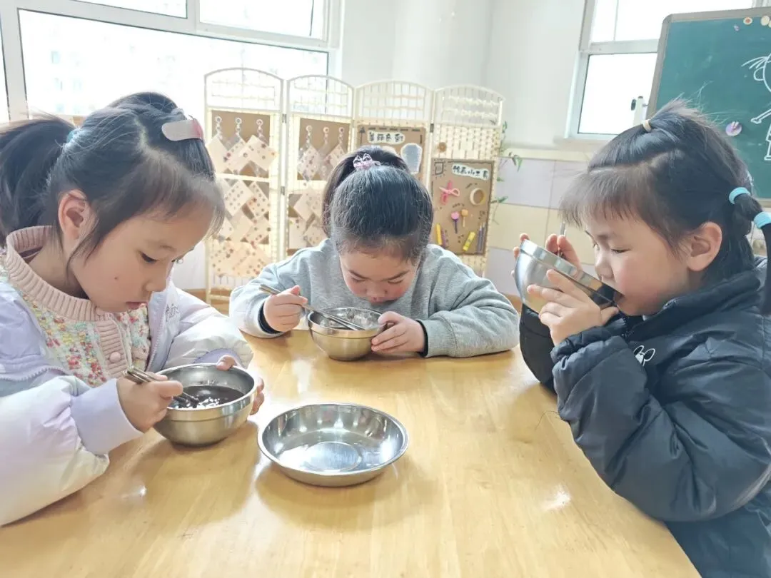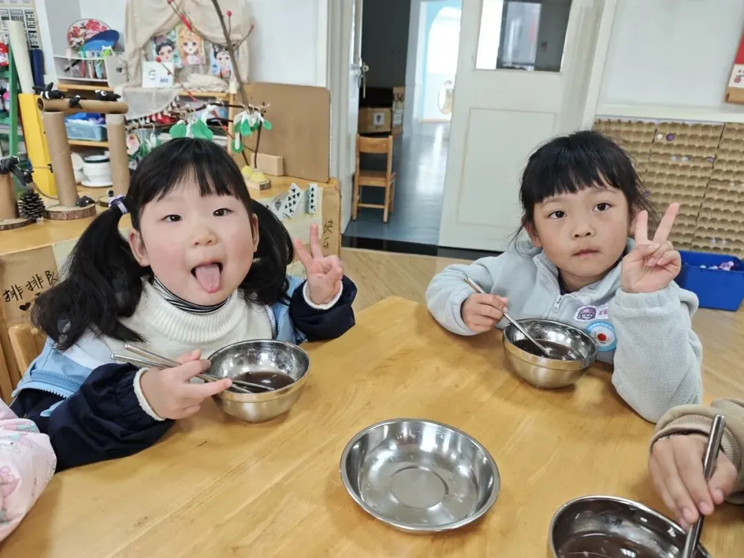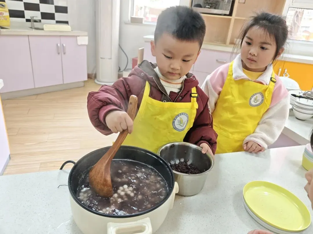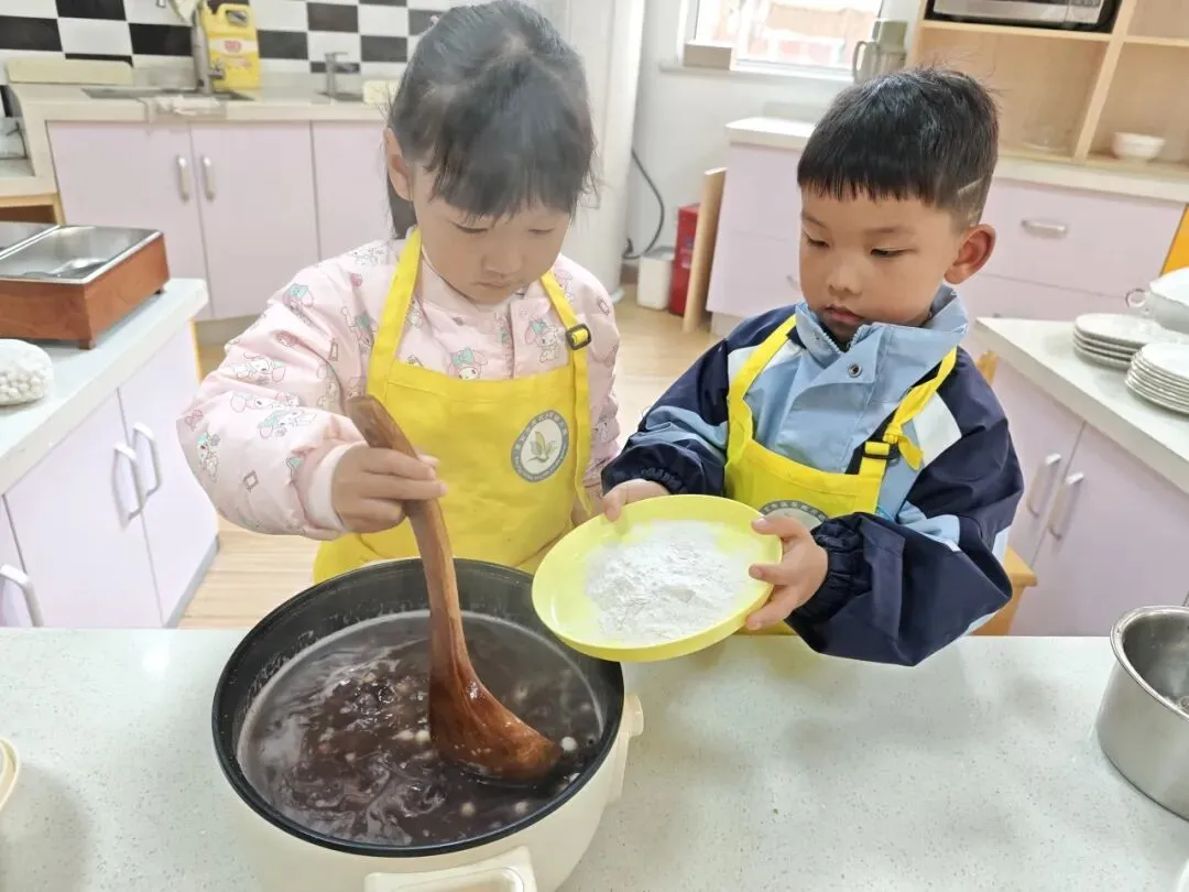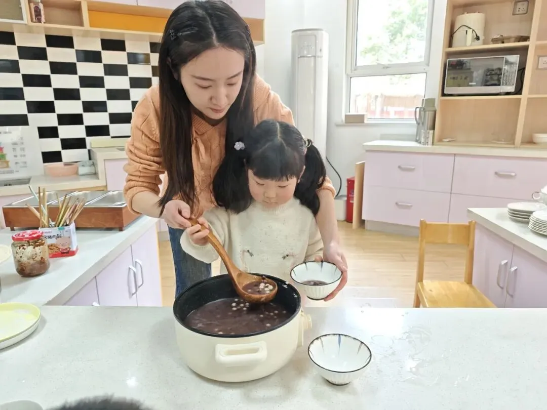 倒入小汤圆、提前煮好的红豆以及加入适量的藕粉搅拌均匀,一份香甜软糯的赤豆元宵就完成啦!大家细细品尝着自己亲手制作的劳动成果,并将这份可口的小吃分享给了园长妈妈和辛勤的老师们。