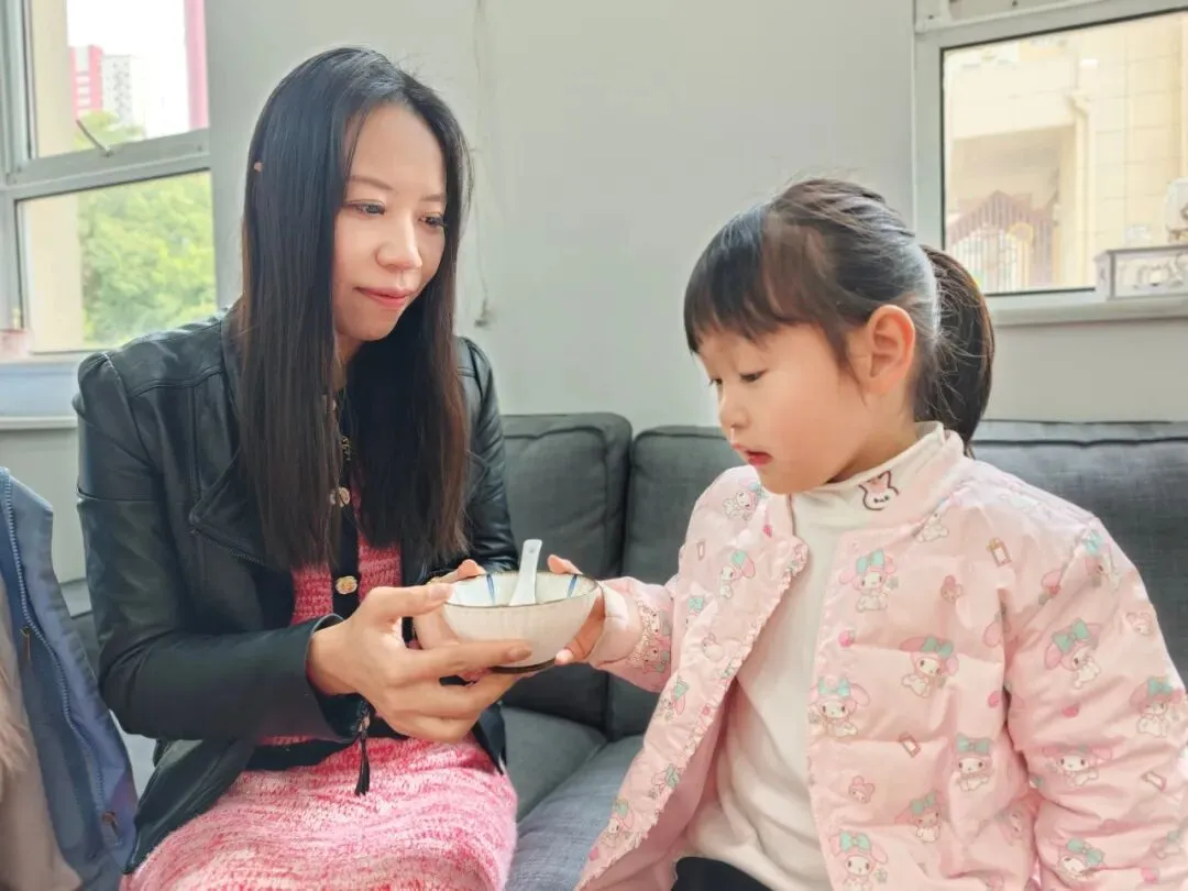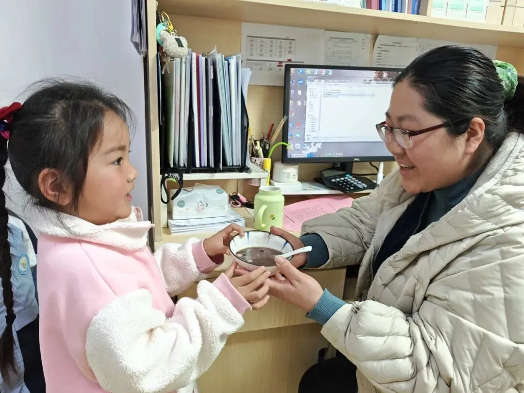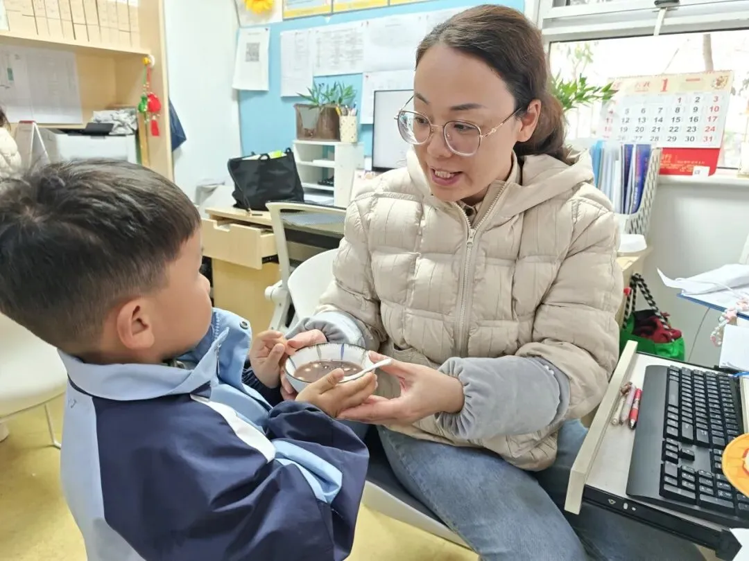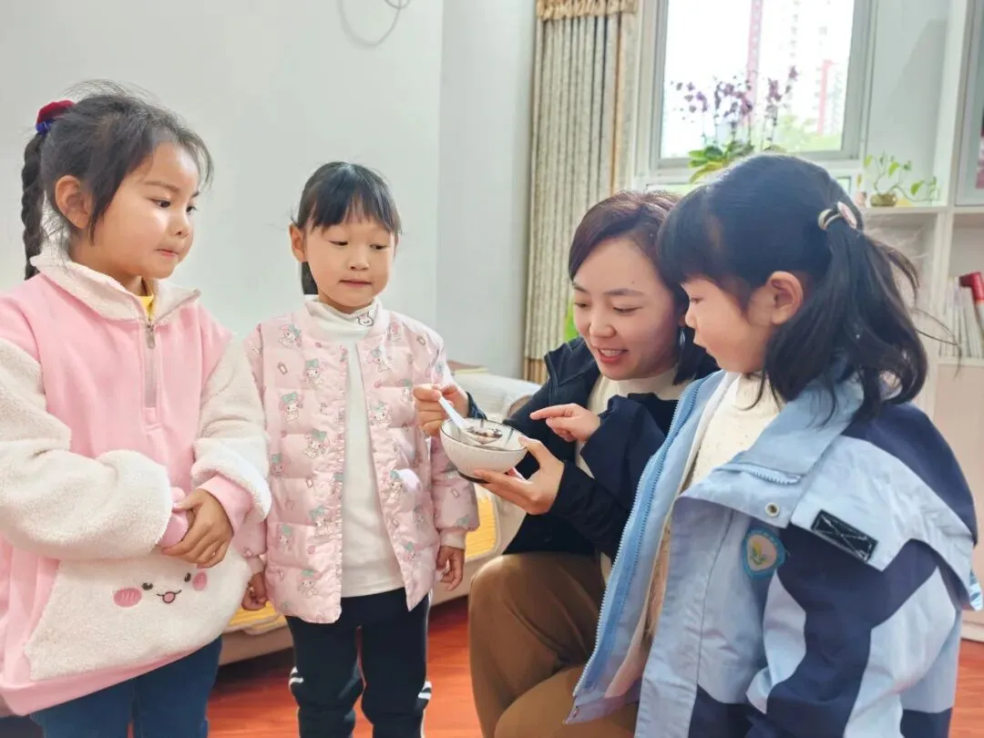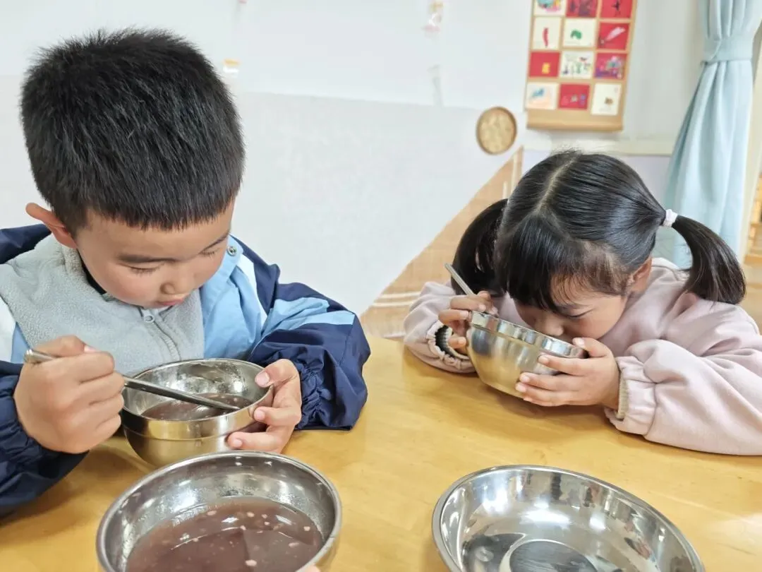 倒入小汤圆、提前煮好的红豆以及加入适量的藕粉搅拌均匀,一份香甜软糯的赤豆元宵就完成啦!大家细细品尝着自己亲手制作的劳动成果,并将这份可口的小吃分享给了园长妈妈和辛勤的老师们。