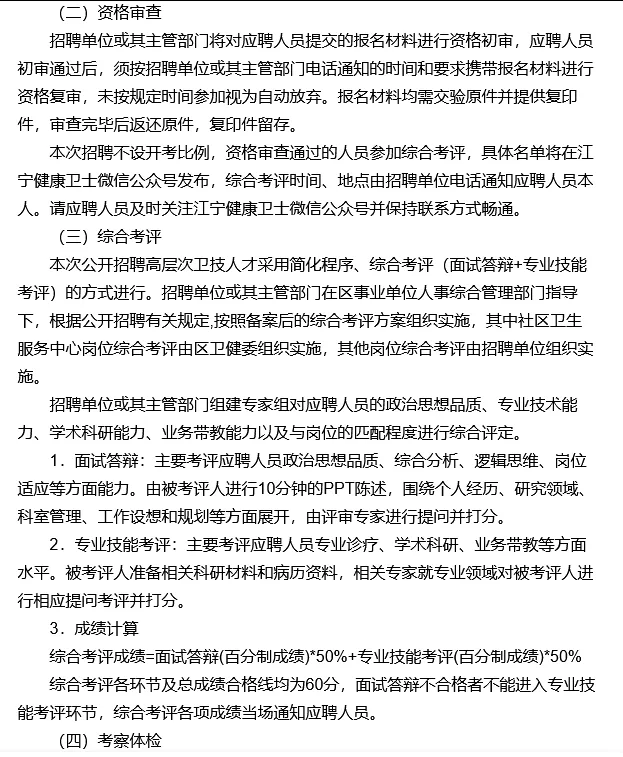 在综合考评成绩合格人员中,按岗位招聘数1:1的比例从高分到低分,确定参加考察体检人员,如综合考评成绩相同,按专业技能考评成绩从高到低的顺序确定参加考察体检人员,如专业技能考评成绩仍相同,招聘单位可对成绩相同的人员组织加试。考察体检人员名单及相关要求将于综合考评结束后的五个工作日内,在江宁健康卫士微信公众号发布,并电话通知应聘人员本人。