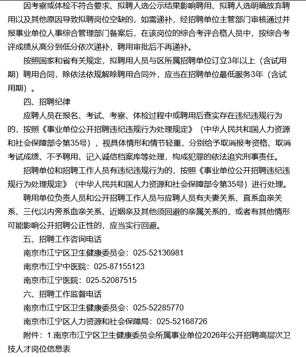 招聘单位根据综合考评成绩、考察和体检结果,研究确定拟聘用人员名单。拟聘用人员名单在南京市江宁区人民政府网公示7个工作日。公示内容包括招聘单位、岗位名称、拟聘用人员姓名、学历、专业、职称资格、毕业院校、现工作单位、各项成绩、总成绩、排名等。