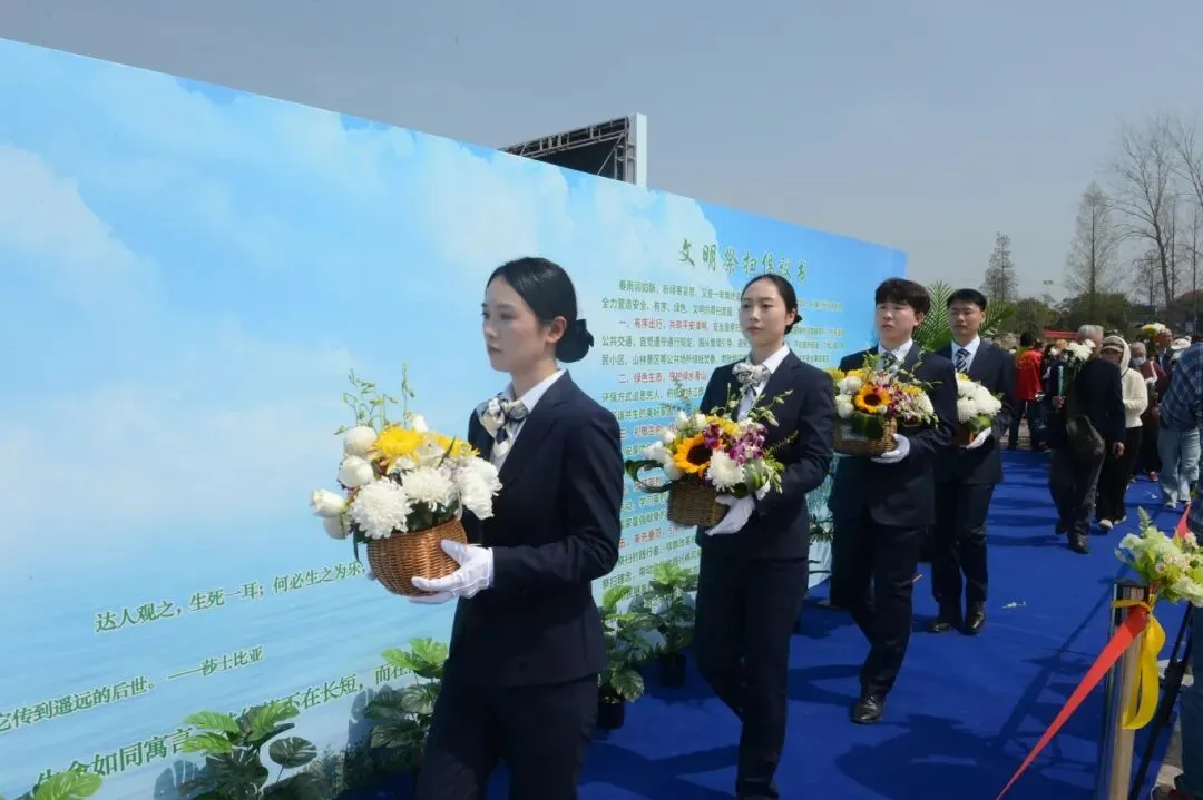 仪式的核心环节——祭祀三献礼,礼仪人员依次敬献鲜果、美酒、鲜花,全程仪轨严谨、仪态庄重,尽显中华传统祭祀文化的深厚底蕴。三献礼仪式结束后,主持人深情致辞,深切寄托追思缅怀,积极弘扬文明祭扫新风。紧接着,一级演员铁金良登台诵读祭文,言辞恳切、意蕴绵长,深刻诠释慎终追远的传统美德。