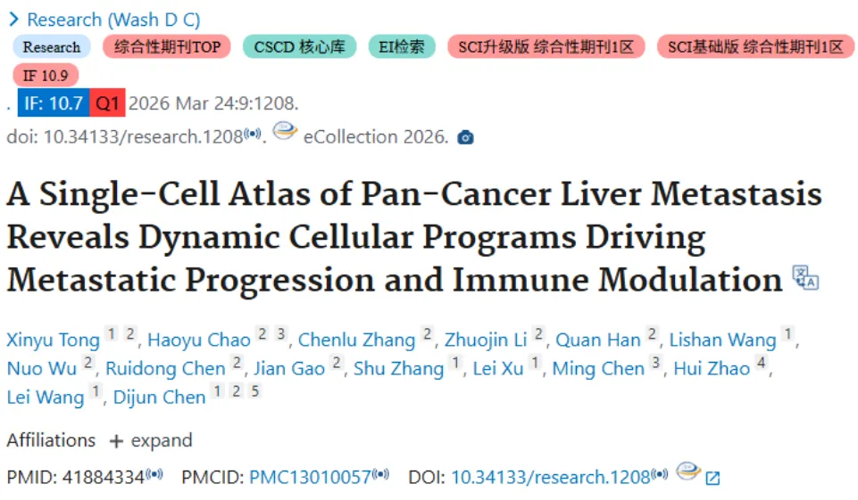 ✨本次为大家介绍南京鼓楼医院发表于《Research》(影响因子 10.9)的重磅研究。该研究依托 100 例单细胞测序样本,涵盖超 46 万个细胞,成功绘制出泛癌肝转移的高分辨率单细胞图谱,深度揭示了肿瘤转移进展与免疫调控的内在机制。