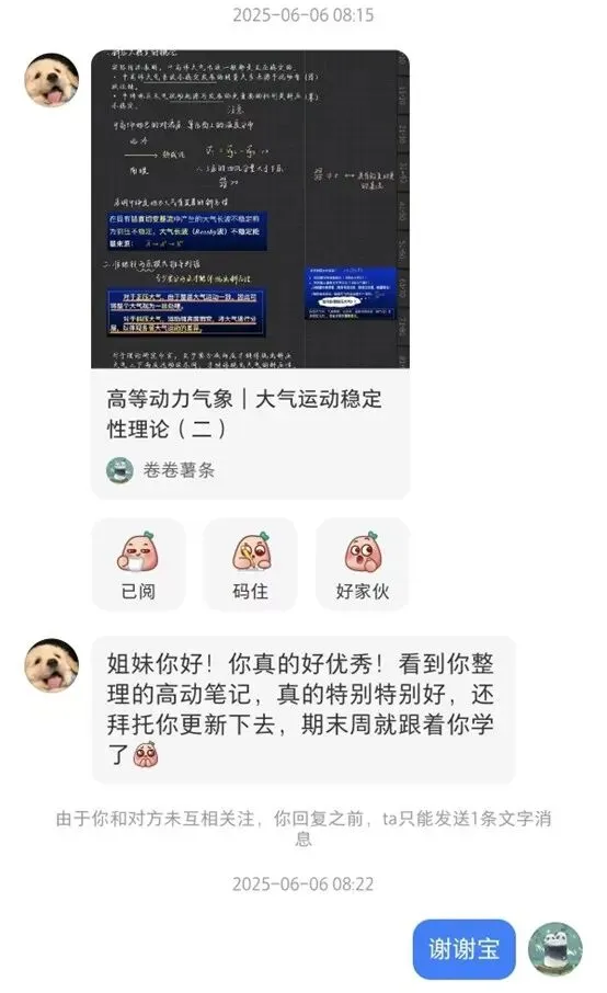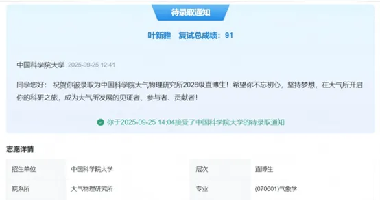 论文初成后,因中文期刊审稿周期较长,她果断决定改投英文期刊。这意味着不仅要克服语言壁垒、精准翻译实验数据,更要重写偏重理论推导的引言部分。那个寒假,她夜晚挑灯夜战研读数十篇英文文献,反复打磨修改,最终成功投递。就在她赴中国科学院大气物理研究所参加面试的前一晚,她在酒店备考时意外收到录用通知,激动地将答辩ppt中“在投”改为“录用”。