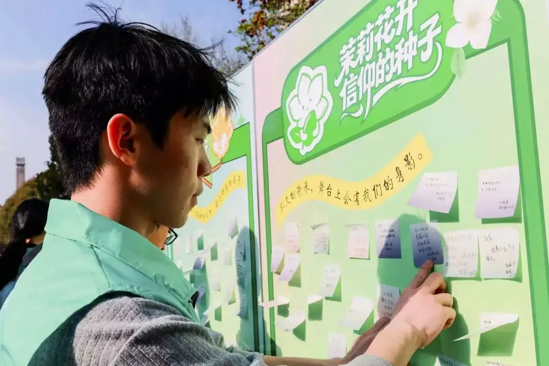 信仰播种,是红色传承的生动实践,更是青年担当的鲜活体现。青年演员们手持彩色便签,写下青春誓言与信仰期许,郑重粘贴在“播种・萌芽・花开”三阶段流动展板的“播种板”上。