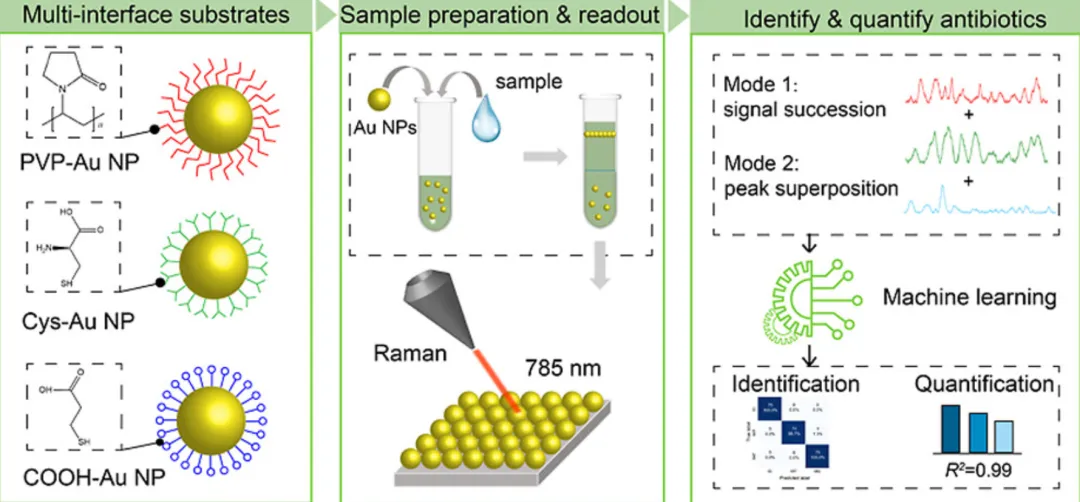 针对上述痛点,团队构建双模式响应 SERS 传感阵列:采用聚乙烯吡咯烷酮(PVP)、L‑半胱氨酸(Cys)、3‑巯基丙酸(MPA)分别功能化金纳米颗粒,制备三种互补响应底物,形成信号接替与峰叠加两种拉曼响应模式。其中,PVP‑Au 体系随抗生素浓度升高发生配体交换,基底信号减弱、待测物信号增强;Cys‑Au 与 COOH‑Au 体系因强 Au‑S 键保持基底信号,与抗生素特征峰叠加,大幅提升光谱信息维度。