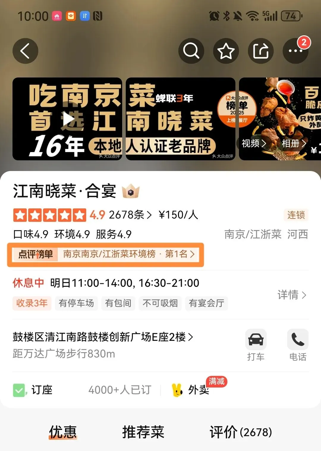对于此次登顶,业内人士分析认为,江南晓菜·合宴的环境榜第一,折射出南京餐饮消费的深层趋势——消费者不再仅仅满足于饱腹,而是追求“环境×口味×服务”的复合体验。从夫子庙商圈的品质化转型,到河西商务区的精致化升级,南京正在从“旅游打卡地”向“品质生活圈”加速迈进。