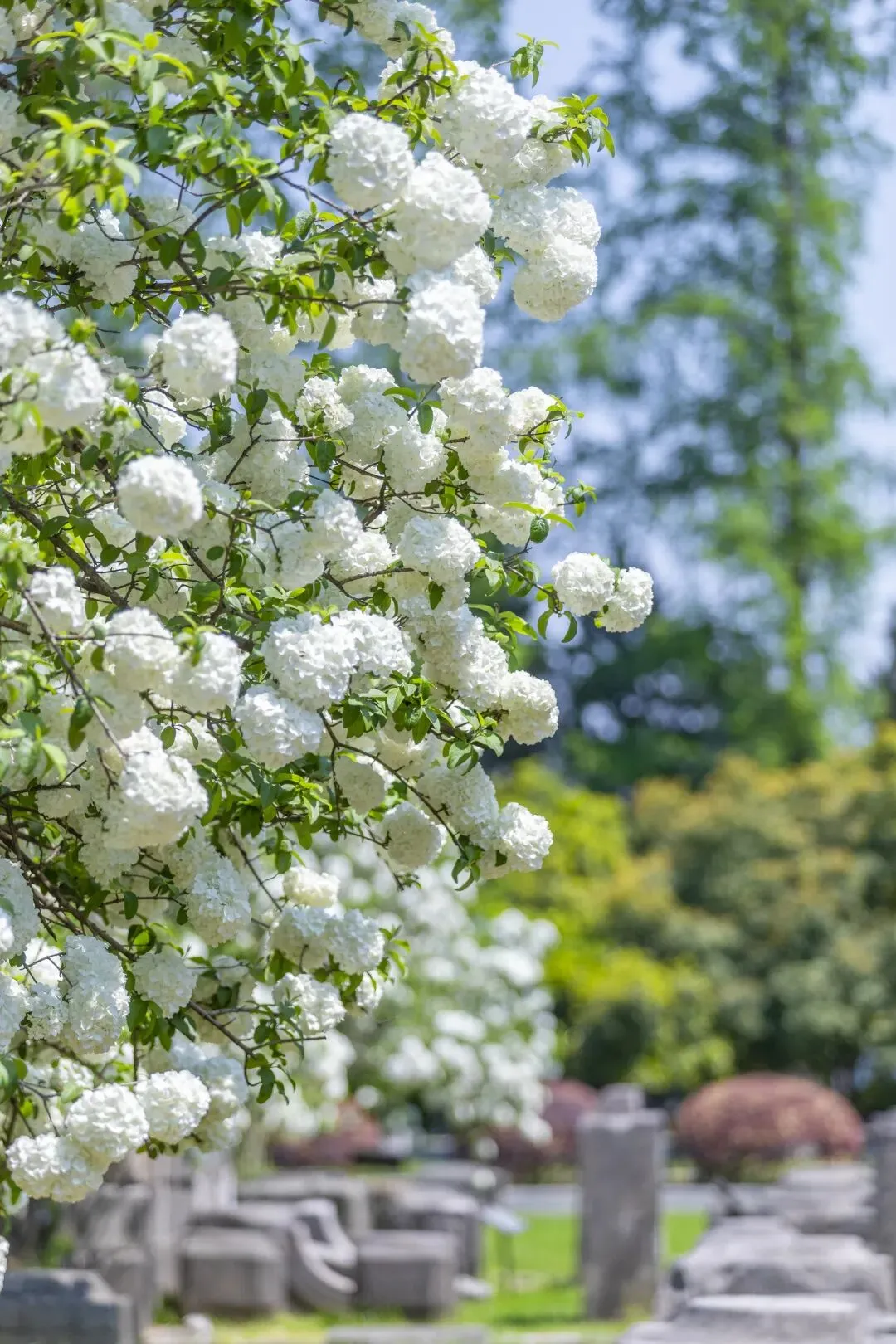 2️⃣午朝门公园:古遗址配绣球,历史感满满!在南京午朝门拍木绣球,是历史与春天的双重浪漫。斑驳石础诉说朝代更迭,而年复一年盛放的木绣球,却让肃穆古迹生出温柔生机。