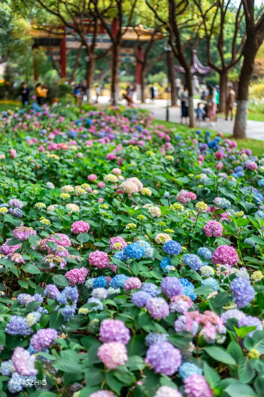 3️⃣绣球公园:名字不是白叫的,绣球成片开放!城墙下的木绣球适合慢慢欣赏,绣球公园靠着阅江楼和中山码头,赏完花可以去附近 Citywalk~