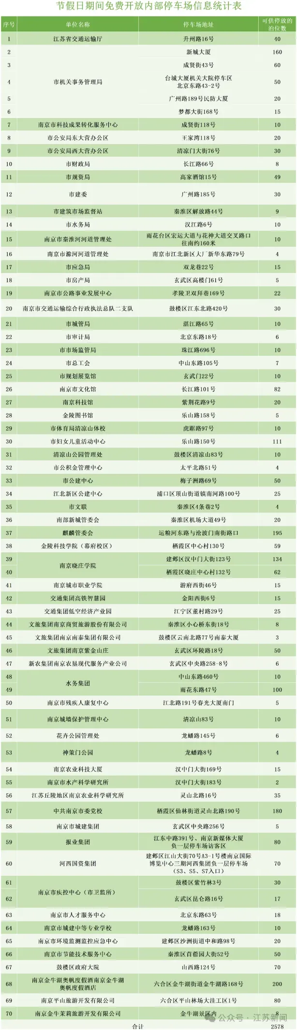 为进一步缓解来宁外地车辆停车难题,记者了解到,南京市城管局会同市机关事务管理局,释放出70处机关企事业单位内部停车场,共计2578个泊位,清明假期期间(4月4日00:00至4月6日24:00)面向外地号牌7座及以下小型车辆,全天候免费开放!