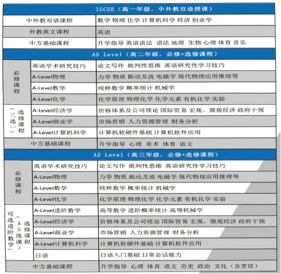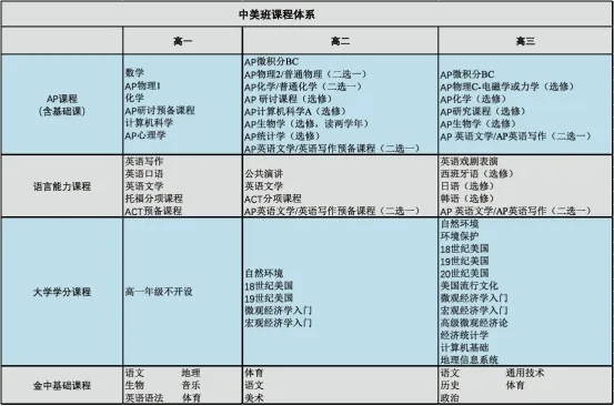 剑桥班课程体系包含理科课程、英语语言课程、经济、商业、创业学、计算机科学课程及金中基础课程,由一年IGCSE和两年A-Level课程组成。理科部分开设数学、进阶数学、物理、化学科目。剑桥班英语课程根据学生能力,构建了逐步提升的语言课程体系:高一开设ESL英语,高二和高三学习EAR英语学术研究,同时提供IPQ英语国际项目研究的辅导,供学生自主选择。