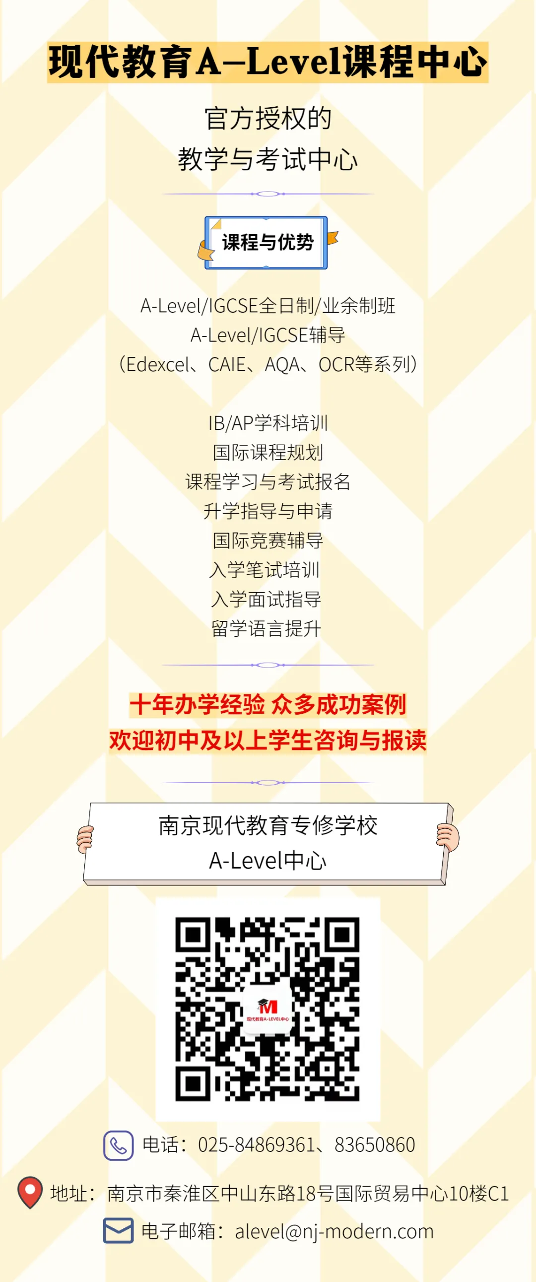 如果你渴望走进金陵中学国际部,解锁国际化成长之路;如果你需要专业的课程辅导、升学规划,助力自己在留学赛道上脱颖而出,可以联系我们南京现代教育alevel国际课程中心。我们将以雄厚的师资、科学的规划、贴心的服务,帮你衔接金中优质资源,补齐能力短板,让每一份努力都能收获回响,让每一个留学梦想都能落地生根。