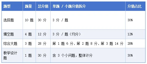 26年数学试卷各题型题量、分值拆分清晰,单题分值梯度明显,教学设计题分值占比最高(30%),凸显教学能力考查的重要性,具体分布如下: