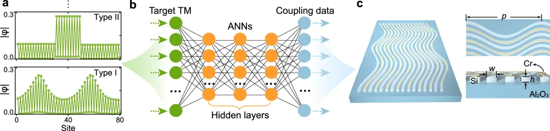 他们预先训练一个神经网络模型,输入目标光强分布(比如一个笑脸轮廓),模型就能自动输出对应的波导耦合参数和规范场配置。实验中,他们在硅光子芯片上成功实现了多种定制化拓扑模式(见下图),且这些模式依然严格位于能隙中,与体态完全隔离,同时损耗极低。