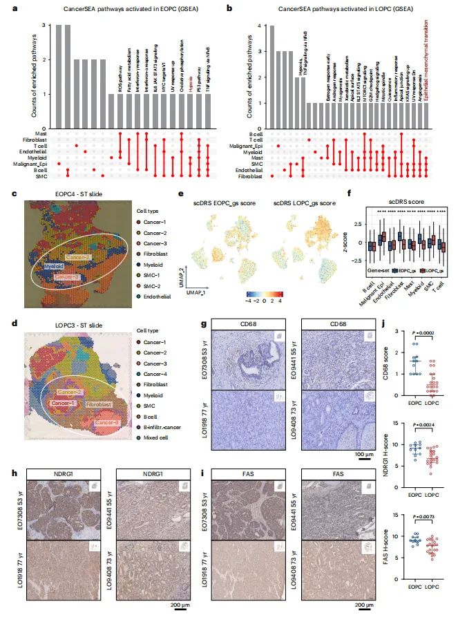 EOPC富集免疫细胞与平滑肌细胞,雄激素应答、缺氧及脂肪酸代谢通路激活;LOPC富集上皮细胞与成纤维细胞,上皮间质转化通路上调(图1-2)。