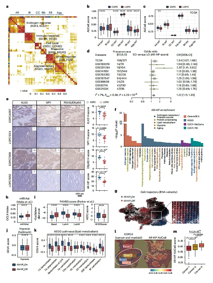 EOPC中雄激素应答元程序高表达,与ErbB信号、缺氧及脂质代谢正相关;LOPC中侵袭性元程序(与EMT相关)更活跃(图3)。