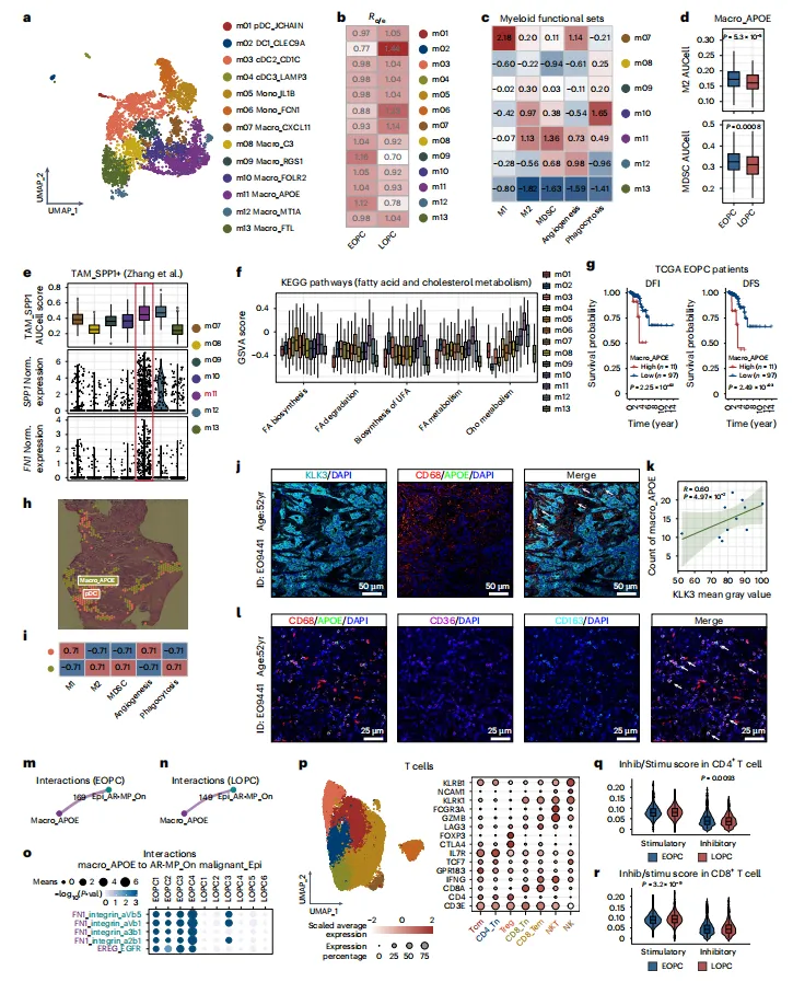 EOPC中鉴定出APOE⁺ TAM亚型,具M2型及髓源性抑制细胞特征,通过FN1-整合素、EREG-EGFR与肿瘤细胞互作,并与不良预后相关(图4)。
