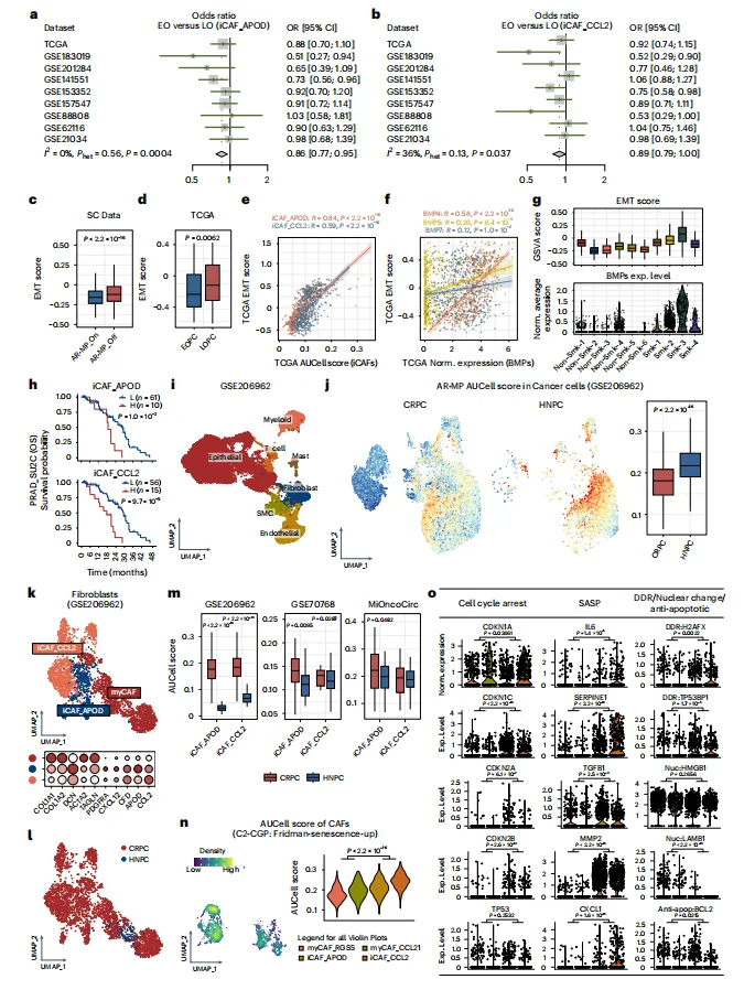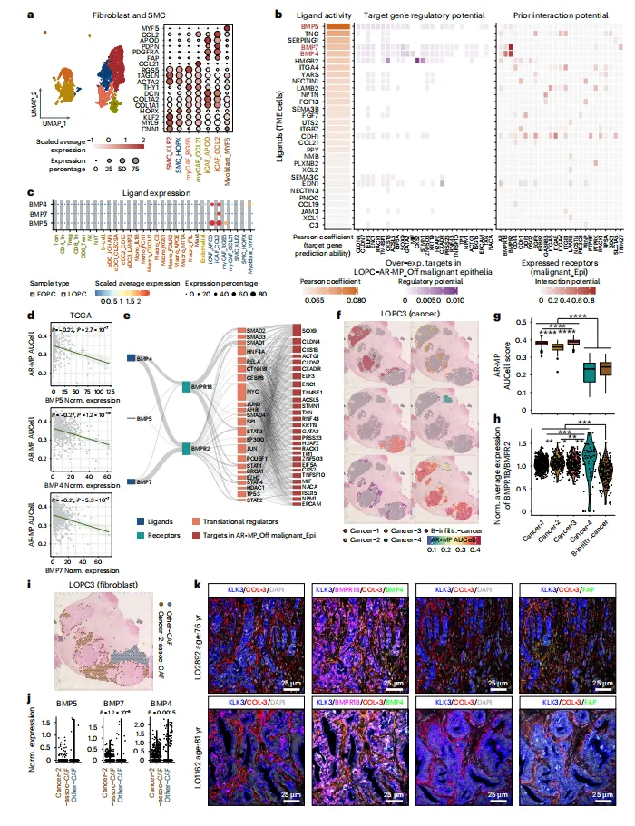 LOPC中炎性癌相关成纤维细胞高表达BMPs,通过BMP-BMPR信号下调AR-MP,激活EMT通路,与肿瘤进展及不良预后相关(图5-6)。