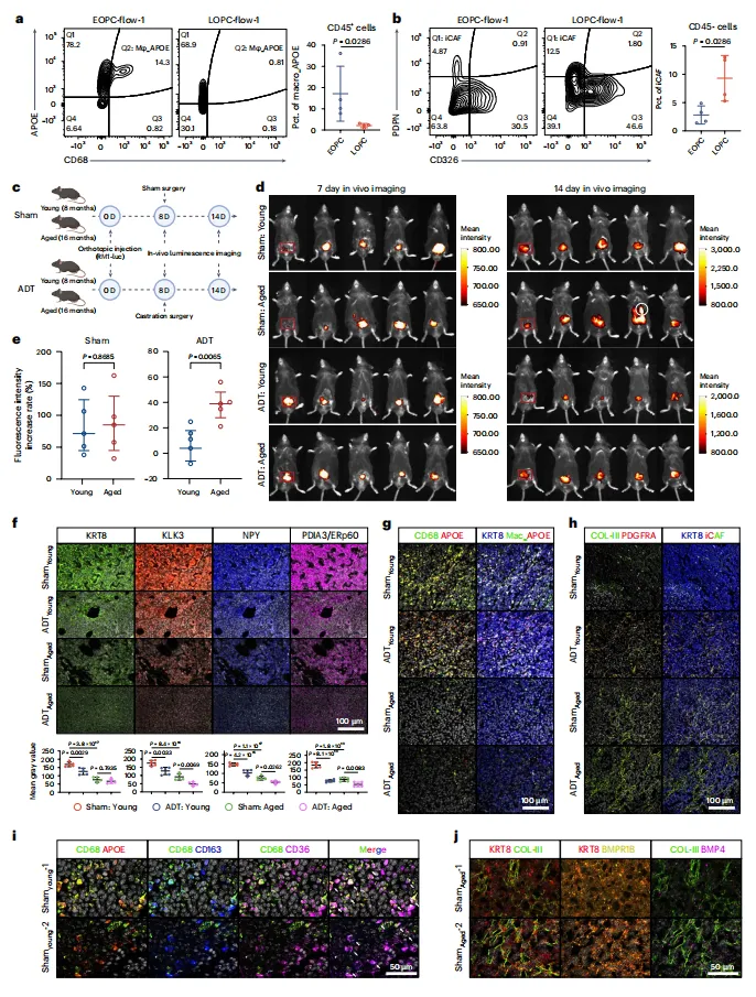 EOPC以雄激素应答元程序激活为特征,与APOE⁺肿瘤相关巨噬细胞在缺氧、脂质代谢重编程的微环境中互作;LOPC则表现为AR-MP下调,炎性癌相关成纤维细胞通过BMP-BMPR信号诱导上皮间质转化及去势抵抗。动物模型证实年轻小鼠对去势治疗更敏感,为年龄特异性精准干预提供了依据。