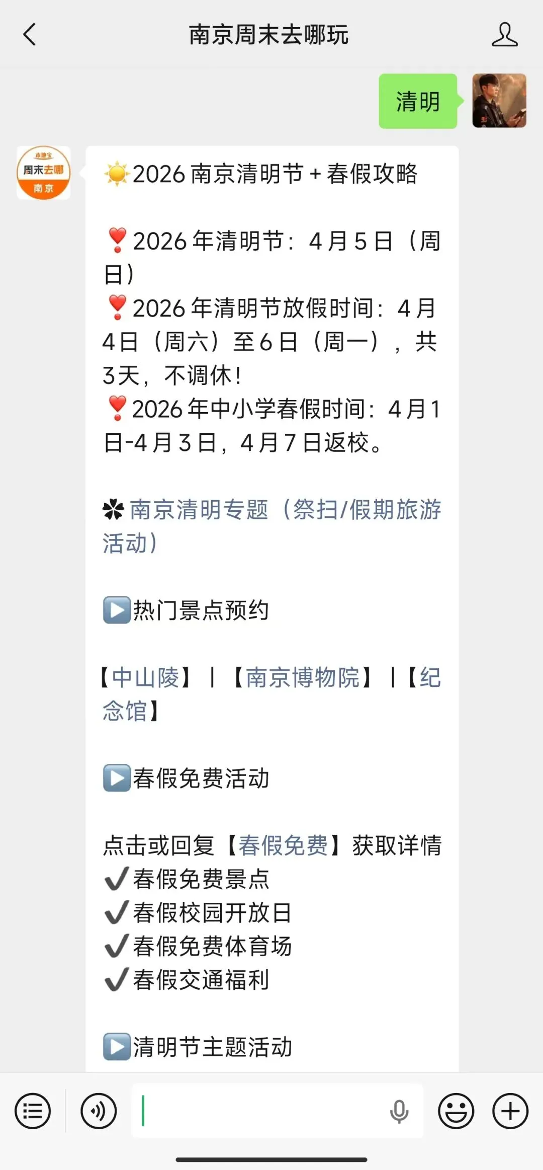 小编提醒:扫描下方二维码,关注【南京周末去哪玩】公众号,私信回复【清明】即可获取南京清明活动攻略、春假免费活动等信息