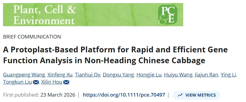 近日,《Plant, Cell & Environment》杂志在线发表了南京农业大学园艺学院侯喜林教授团队题为“A Protoplast‐Based Platform for Rapid and Efficient Gene Function Analysis in Non-Heading Chinese Cabbage”的研究论文,开发了组织和基因型非依赖的不结球白菜原生质体分离体系,并构建了整合蛋白亚细胞定位、蛋白互作验证、CRISPR/Cas9编辑预筛选以及高通量组学测序等多功能分析的高效研究平台(图1),为不结球白菜以及其他十字花科非模式蔬菜的功能基因组学研究提供了有效的工具。
