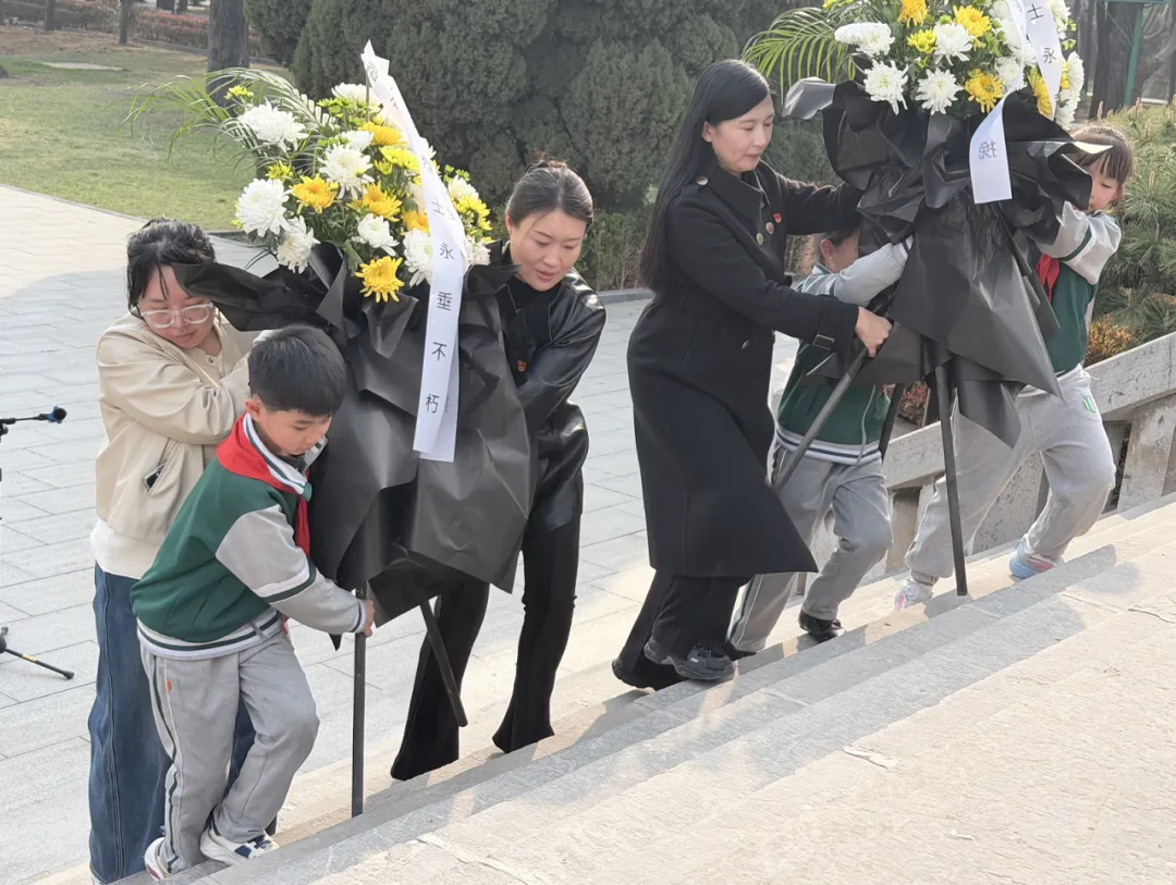 松柏苍翠,陵园肃穆。师生整齐列队,在雄壮的国歌声中肃立默哀,向革命先烈表达深切哀思。党员与少先队员代表敬献花篮,党员教师整理缎带,表达崇高敬意。
