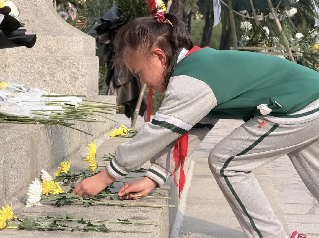 在烈士纪念碑前,少先队员重温入队誓词,党员教师重温入党誓词,铿锵誓言彰显坚定信念。少先队员擦拭墓碑、敬献小白花,副校长刘彬彬现场讲述英烈事迹,将红色种子播撒心间。