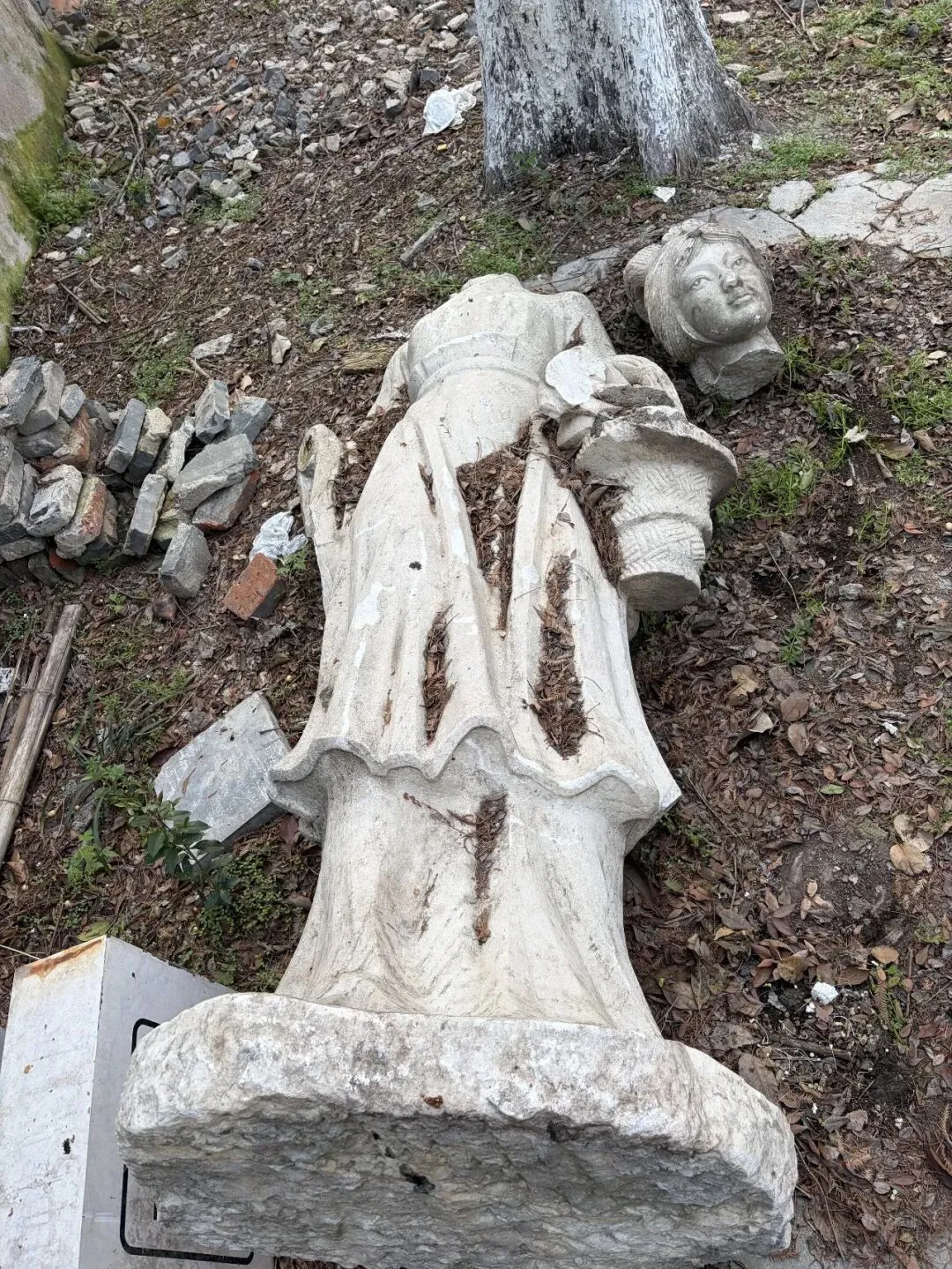 旁边断头的古代仕女石像,雕刻十分精美,栩栩如生,是否是某个朝代的莫愁女石像?因何被斩首至此?