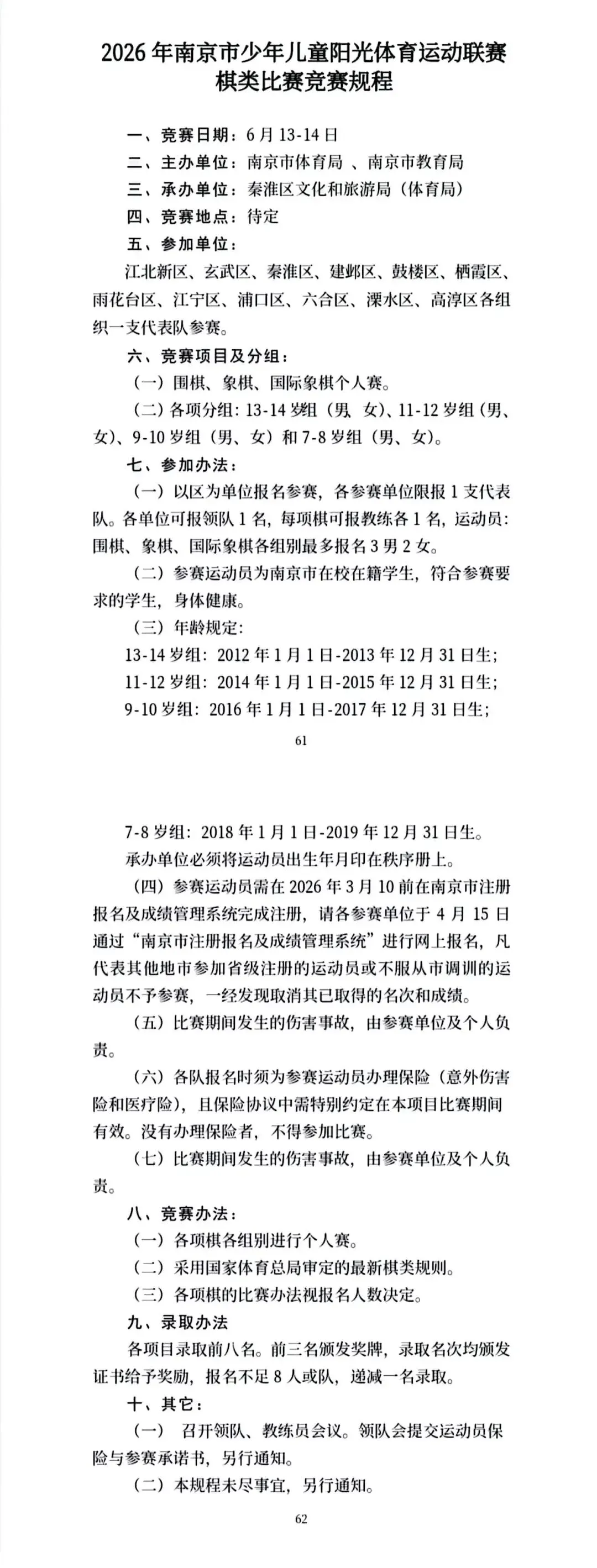 >2026年南京市少年儿童阳光体育运动联赛 棋类比赛竞赛规程