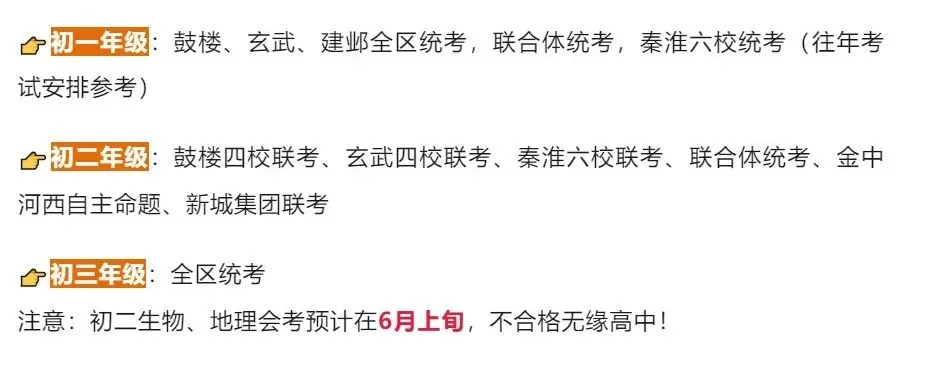 初一年级:鼓楼、玄武、建邺全区统考,联合体统考,秦淮六校统考