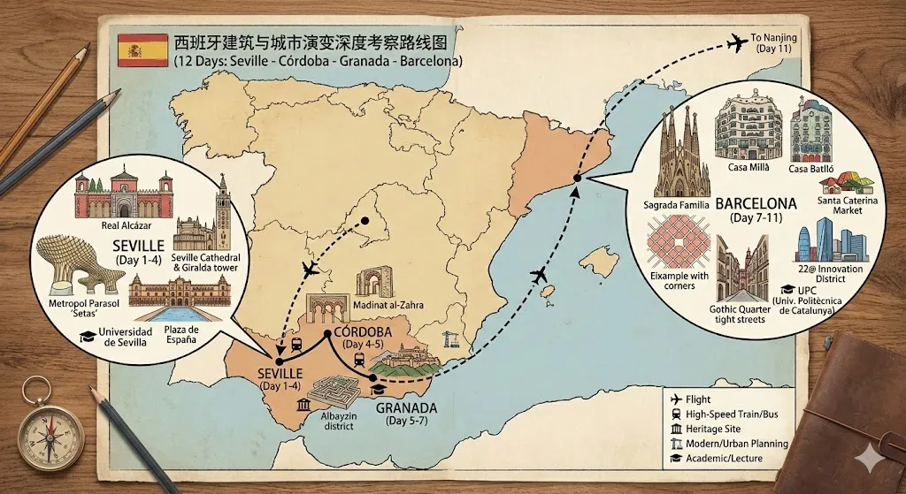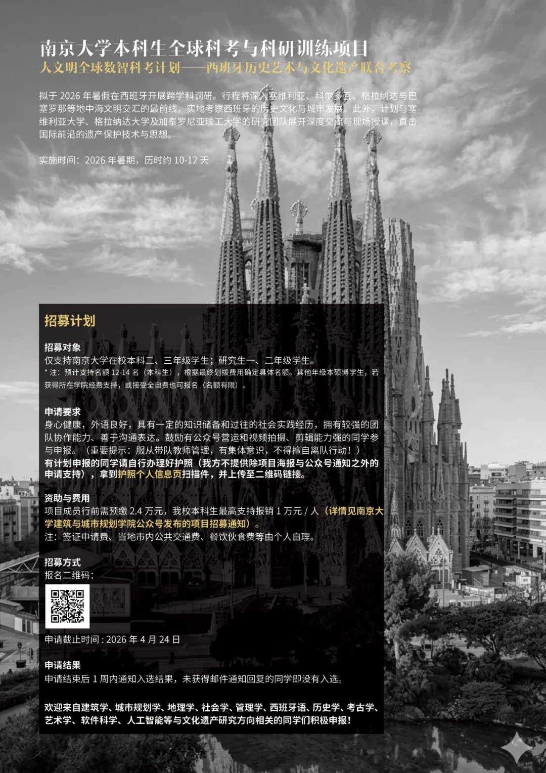 由南京大学建筑与城市规划学院牵头,联合社会学院、历史学院、艺术学院及党委宣传部,共同打造“大文明全球数智科考计划——西班牙历史艺术与文化遗产联合考察” 经本科生院批准与支持,遴选为2026年“南京大学本科生全球科考与科研训练项目”。 拟于2026年暑假在西班牙开展跨学科调研。行程将深入塞维利亚、科尔多瓦、格拉纳达与巴塞罗那等地中海文明交汇的最前线,实地考察西班牙的历史文化与城市发展。此外,计划与塞维利亚大学、格拉纳达大学及加泰罗尼亚理工大学的研究团队展开深度交流与现场授课,直击国际前沿的遗产保护技术与思想。这些城镇拥有丰富的历史遗迹和建筑,对于理解西班牙的历史、文化和城市发展具有重要意义。