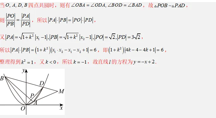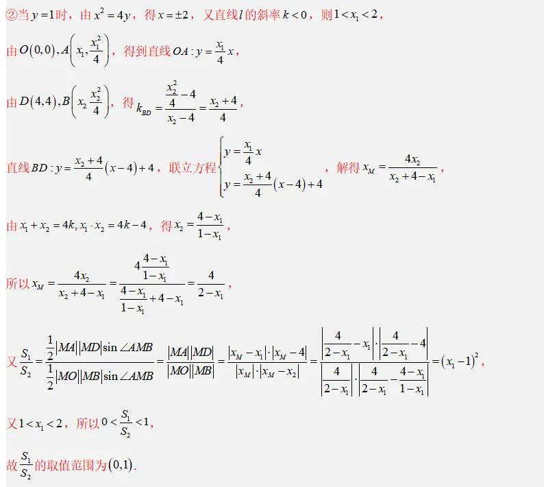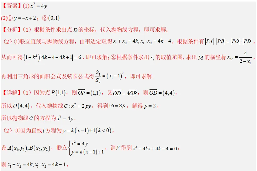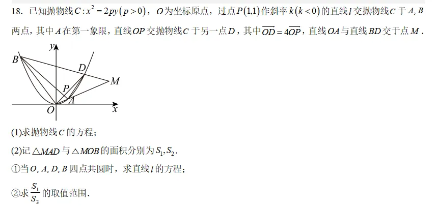 这道题是高考数学中解析几何的典型压轴题,综合考查抛物线方程、直线与圆锥曲线的位置关系、四点共圆条件、面积比取值范围等。整体难度较大,属于中高难度层级,尤其第(2)问的②涉及参数范围与函数最值,对运算能力和几何转化能力要求较高。从近年新高考卷来看,抛物线作为解答题出现的频率略低于椭圆,但每年均有涉及,此题设问方式新颖(共圆、面积比),预测在模拟卷中常见,高考中也有一定概率出现,约为30%,多出现在第18或19题位置。