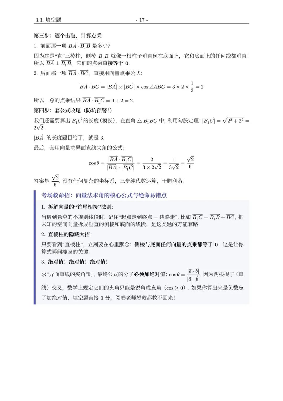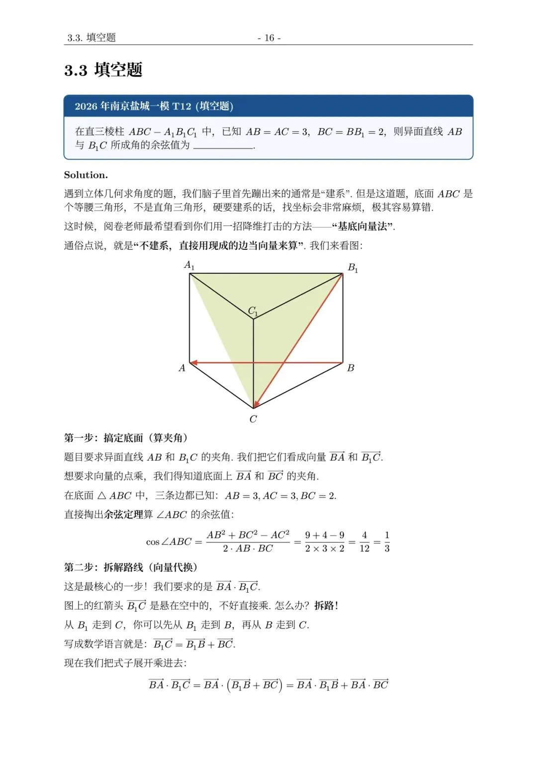 1. “直三棱柱”是题眼:只要看到这个词,立刻要想到侧棱与底面任何向量的点乘都等于 0。这是向量法“瞬间瘦身”的关键。