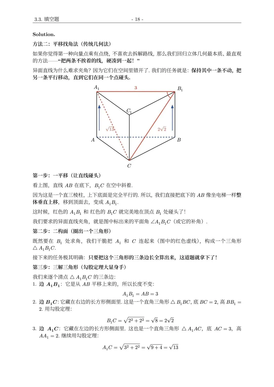 3. 边 A1C:在左边的长方形侧面里,底边 AC 是 3,高 AA1 是 2,勾股定理算出长度是 根号13。