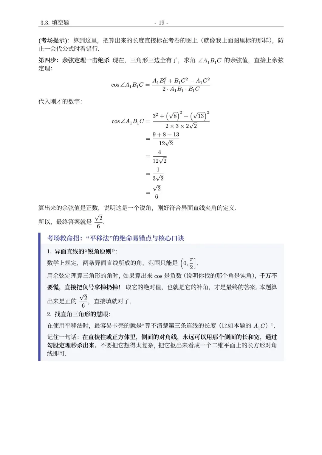 向量 BA 的长度是 3。向量 B1C 的长度在直角三角形 B1BC 中用勾股定理算出来是 2倍根号2。最后,余弦值等于点乘结果 2,除以这两个长度的乘积(即 3 乘以 2倍根号2),化简得到六分之根号二。
