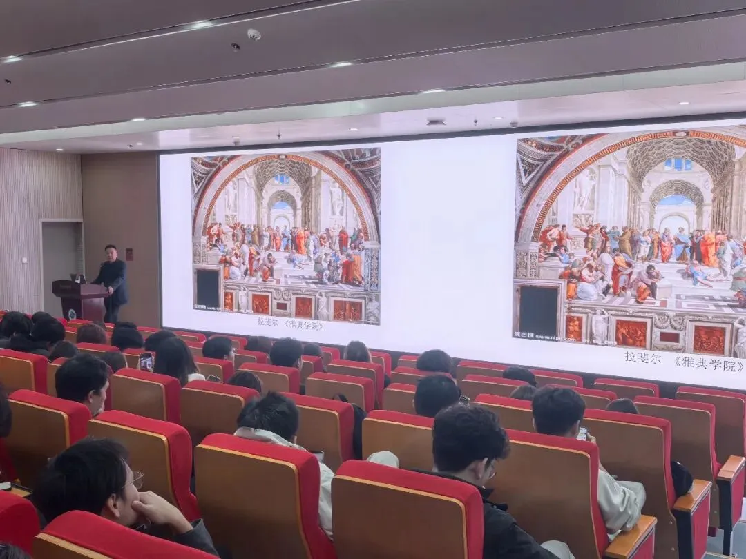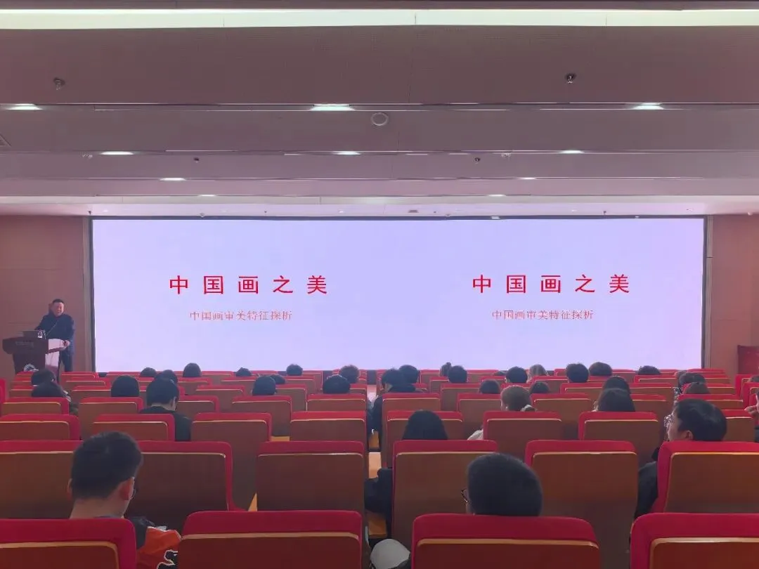 讲座伊始,许建康教授以东西方经典绘画作品为引,从历代名家名作展开讲解,瞬间抓住同学们的注意力。在讲解东西方绘画比较时,许建康教授从审美观念、观察方法、造型方法、工具材料等维度进行对比。还讲解了中国画在其漫长的发展进程中,从以线为其造型手段,将书法用笔导入绘画,崇尚水墨神韵的基础上,逐渐完善并形成独树一帜的东方体系。并着重指出诗、书、画、印四者完美的结合,是中国画区别于其它绘画形式的根本特征,其已深度融入国画创作与鉴赏全过程,成为传承中华优秀传统文化的重要载体,让同学们在对比中看到艺术传承与创新的深刻变革,也理解到中国画审美素养的不断提升是传承文化根脉的重要支撑。