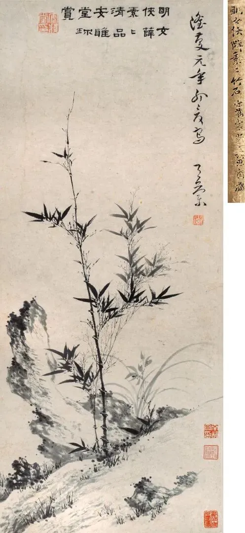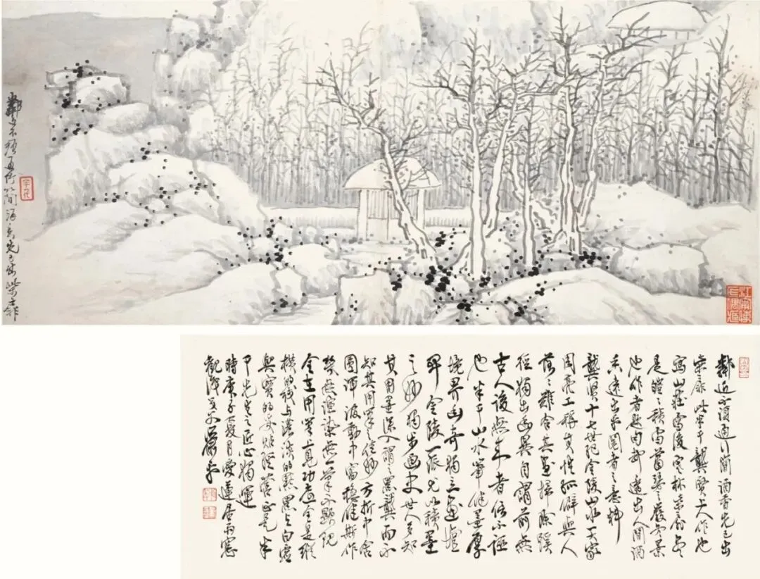 题跋:邻近不须通行简,酒香先已出柴扉。此半千龚贤上人作也。写山庄雪后,寒林柴扉尽是皑皑积雪,萧瑟之严冬景也。作者题句却透出人间酒香,远出乎阅者之意料。龚贤,十七世纪金陵山水一大家。周亮工称其性孤僻,与人落落难合。其画扫除蹊径,独出幽异,自谓前无古人后无来者,信不诬也。半千山水笔健墨厚,境界幽奇,独立画坛,开金陵一派,尤以积墨之妙独步画史。世人多知其用墨深入,谓之黑龚,而不知其用笔之佳妙。方折中含圆浑,波动中寓稳健。斯作几无渲染,无一笔不显现,全在用笔上见功底,全是纵横的线与浓淡的点。黑与白、虚与实的妥帖经营,正是半千先生之匠心独运。时庚子夏月,爱莲居雨窓观识,戈父萧平。钤印:戈父、萧平之