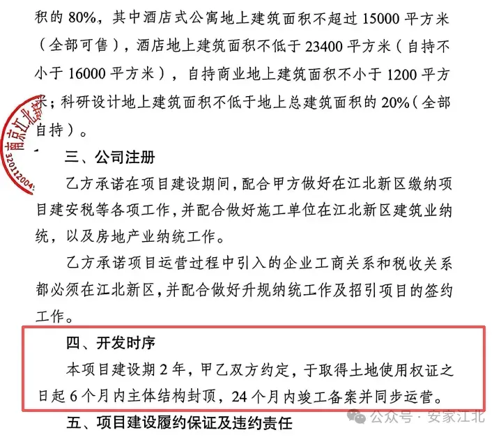 在地块投资发展监管协议中显示,本项目建设期2年,甲乙双方约定,于取得土地使用权证之日起6个月内主体结构封顶,24个月内竣工备案并同步运营。