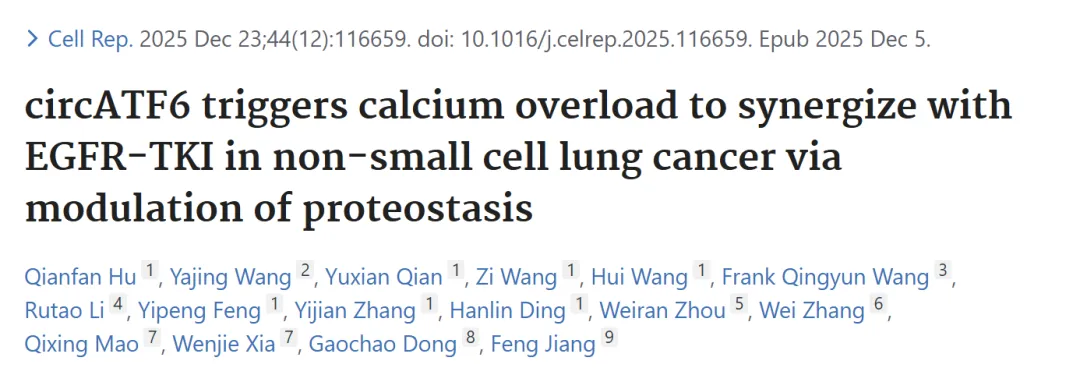 文献来源:Hu Q, Wang Y, Qian Y, Wang Z, Wang H, Wang FQ, Li R, Feng Y, Zhang Y, Ding H, Zhou W, Zhang W, Mao Q, Xia W, Dong G, Jiang F. circATF6 triggers calcium overload to synergize with EGFR-TKI in non-small cell lung cancer via modulation of proteostasis. Cell Rep. 2025 Dec 23;44(12):116659. doi: 10.1016/j.celrep.2025.116659. Epub 2025 Dec 5. PMID: 41351835.
